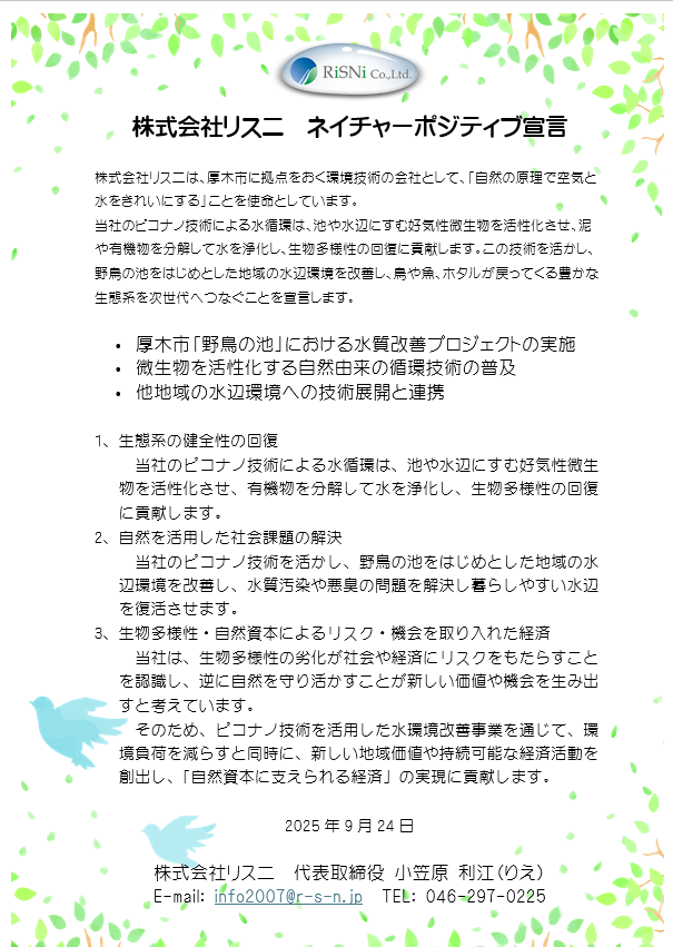 当社のピコナノ技術による水循環は、池や水辺にすむ好気性微生物を活性化させ、泥や有機物を分解して水を浄化し、生物多様性の回復に貢献します。この技術を活かし、野鳥の池をはじめとした地域の水辺環境を改善し、鳥や魚、ホタルが戻ってくる豊かな生態系を次世代へつなぐことを宣言します。